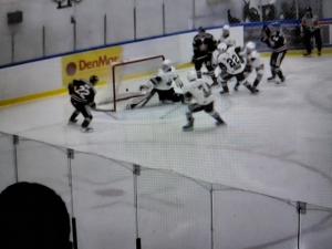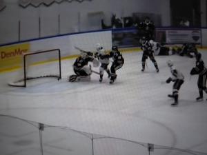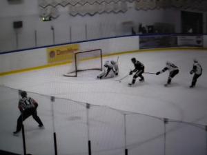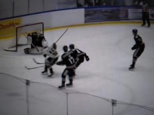 Silas Dromarsky made a nice save on Rykan Lay who was sent in on a breakaway late in the opening period and then another exciting play took place as time was winding down. Jacob Bate came in on a breakaway, went forehand-backhand and beat Dromarsky as the buzzer sounded. It was originally called a good goal by the referee but then after all 4 officials huddled they waived it off which was a good call. You can see the green light come on just before Bate backhands it.
