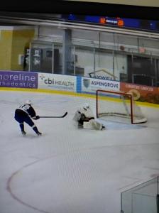 Silas Dromarsky made a nice save on Rykan Lay who was sent in on a breakaway late in the opening period and then another exciting play took place as time was winding down. Jacob Bate came in on a breakaway, went forehand-backhand and beat Dromarsky as the buzzer sounded. It was originally called a good goal by the referee but then after all 4 officials huddled they waived it off which was a good call. You can see the green light come on just before Bate backhands it.